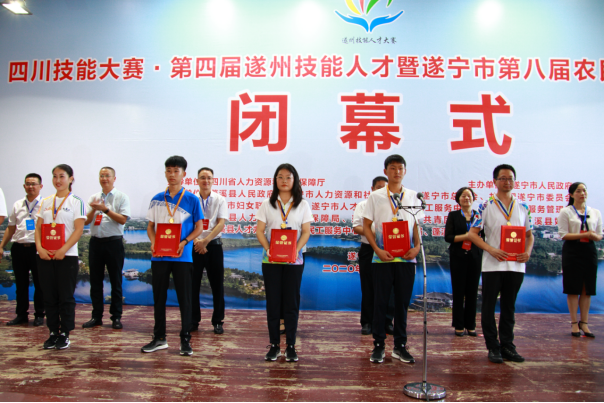 8月26日下午16:30,大賽閉幕式在蓬溪縣實(shí)驗中學(xué)武術(shù)館舉行。閉幕式由市人社局副局長(cháng)郭正輝主持,市政府副秘書(shū)長(cháng)胡健出席并講話(huà),市直相關(guān)部門(mén)負責人、蓬溪縣政府及人社部門(mén)負責人出席。閉幕式上,宣布了獲獎選手名單并進(jìn)行了現場(chǎng)頒獎,蓬溪縣向經(jīng)開(kāi)區移交了大賽賽旗。60名選手分獲此次大賽10個(gè)項目的一、二、三等獎;蓬溪縣、船山區、安居區代表隊因成績(jì)突出榮獲“優(yōu)秀組織獎”;其他縣(市、區)、園區對大賽高度重視、積極參與,被大賽組委會(huì )授予“精神文明獎”。